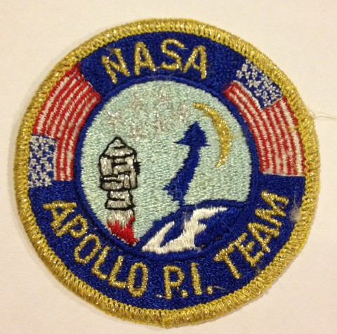 This patch, the seller claims, originated at the Marshall Space Flight Center. It is 4" in diameter and features a unique horizontal rib stitching on the moon's surface. Bare back. The "XV" is retained, in white thread, twill border which gives it a 4" feel).