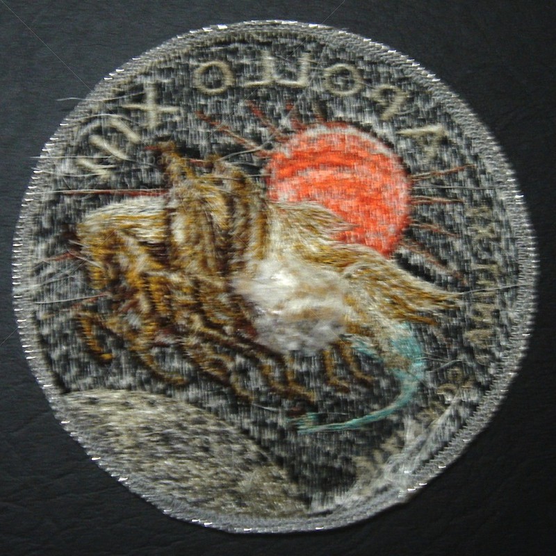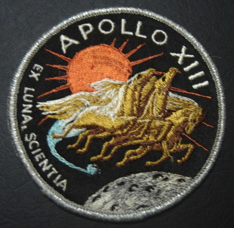 This is the version of the patch that was issued to the Apollo 13 crew, as well as some limited commercial release. Distinct crater detail, the black gaps in the rays of the sun and curved sun stitching pattern sets it apart from the Lion Brothers version. This was made by A-B Emblem.