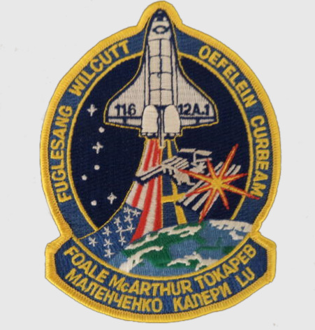 Randy Hunt produced an STS-116 replica patch that represented the original crew: Terry Wilcutt, William Oefelein, Robert Curbeam, Christer Fuglesang, Michael Foale, Yuri I. Malenchenko, RKAm Bill McArthur, Ed Lu, Valery Tokarev, RKA, Aleksandr Y. Kaleri, RKA