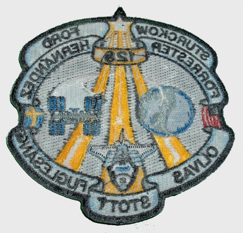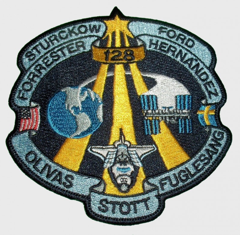 The STS-128 patch symbolizes the 17A mission and represents the hardware, people and partner nations that contribute to the flight. The Space Shuttle Discovery is shown in the orbit configuration with the Multi Purpose Logistics Module (MPLM) Leonardo in the payload bay. Earth and the International Space Station wrap around the Astronaut Office symbol reminding us of the continuous human presence in space. The names of the STS-128 crew members border the patch in an unfurled manner. Included in the names is the expedition crew member who will launch on STS-128 and remain on board ISS, replacing another Expedition crew member who will return home with STS-128. The banner also completes the Astronaut Office symbol and contains the U.S. and Swedish flags representing the countries of the STS-128 crew.