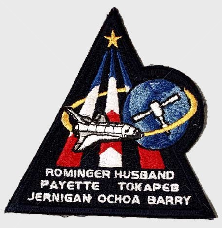 Designed by the crew members, this is the mission insignia for the STS-96 space flight, the second Space Shuttle mission dedicated to the assembly of the International Space Station (ISS). The crew patch highlights the major themes of the Station Program: Earth-directed research, the advancement of human space exploration, and international cooperation. The Space Shuttle Discovery is depicted shortly after reaching orbit as the crew prepares to carry out the first docking with the new Station. At this early stage in its construction, ISS consists of two modules: Zarya and Unity, shown orbiting Earth. The triangular shape of the patch represents building on the knowledge and experience of earlier missions, while the three vertical bars of the astronaut emblem point toward future human endeavors in space. The five-pointed star that tops the astronaut emblem in this depiction is symbolic of the five space agencies participating in the development of ISS: NASA, the Russian Space Agency, the European Space Agency, the National Space Development Agency of Japan, and the Canadian Space Agency. The blend of red, white, and blue is a tribute to the nationalities of the crew members who are from the United States, Canada, and Russia.