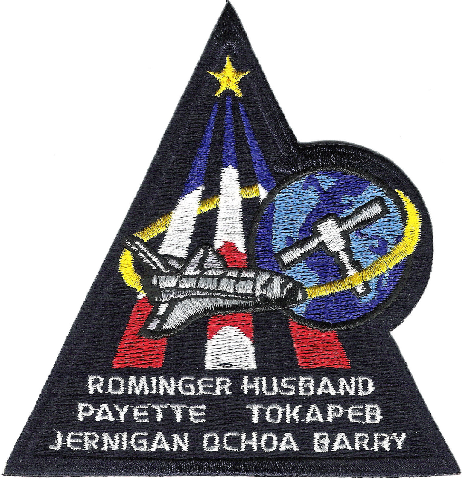 Designed by the crew members, this is the mission insignia for the STS-96 space flight, the second Space Shuttle mission dedicated to the assembly of the International Space Station (ISS). The crew patch highlights the major themes of the Station Program: Earth-directed research, the advancement of human space exploration, and international cooperation. The Space Shuttle Discovery is depicted shortly after reaching orbit as the crew prepares to carry out the first docking with the new Station. At this early stage in its construction, ISS consists of two modules: Zarya and Unity, shown orbiting Earth. The triangular shape of the patch represents building on the knowledge and experience of earlier missions, while the three vertical bars of the astronaut emblem point toward future human endeavors in space. The five-pointed star that tops the astronaut emblem in this depiction is symbolic of the five space agencies participating in the development of ISS: NASA, the Russian Space Agency, the European Space Agency, the National Space Development Agency of Japan, and the Canadian Space Agency. The blend of red, white, and blue is a tribute to the nationalities of the crew members who are from the United States, Canada, and Russia.