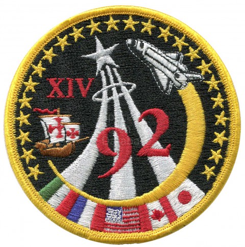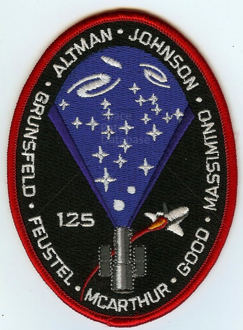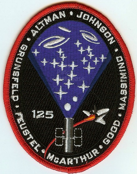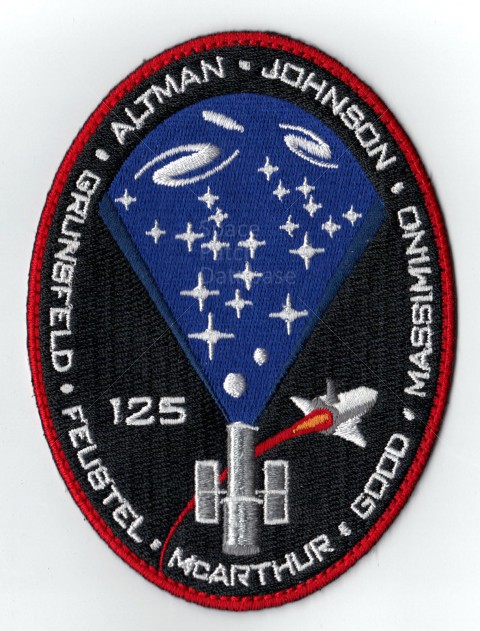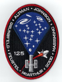 This version of the patch was visible on crew suits during training for the mission and can be identified by the dotted stitching style around the solar panals of the HST. The version that was flown has thicker, solid embroidery around the solar panels.