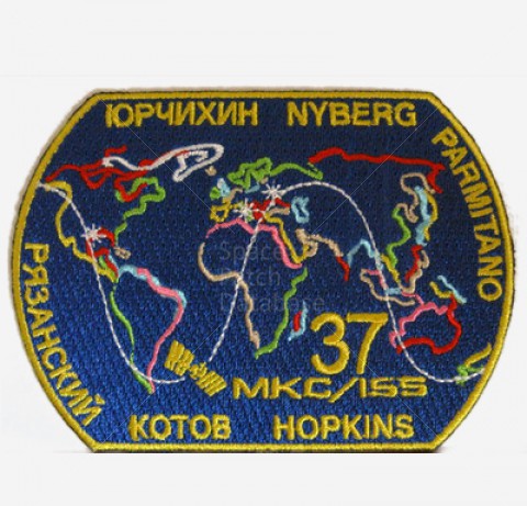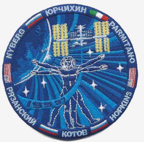Before the final artwork was approved by the crew, NASA sent the order to A-B Emblem to produce this version. It was later replaced by the blue, circular Vitruvian man version. This would be one of three different artworks for Expedition 37.