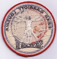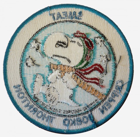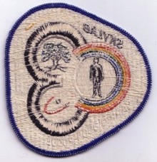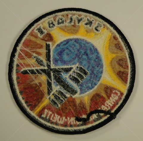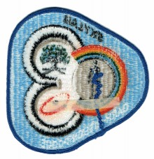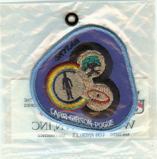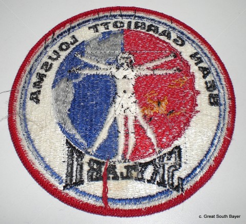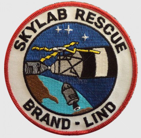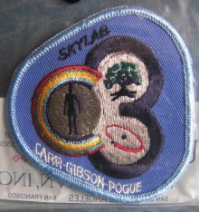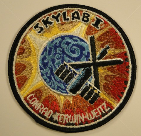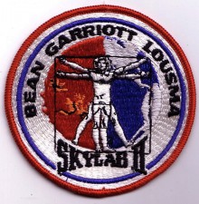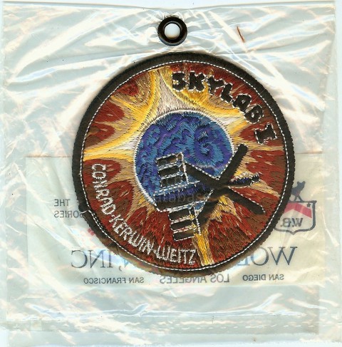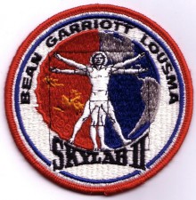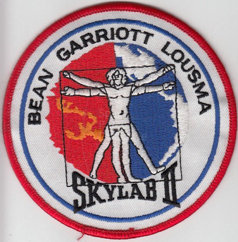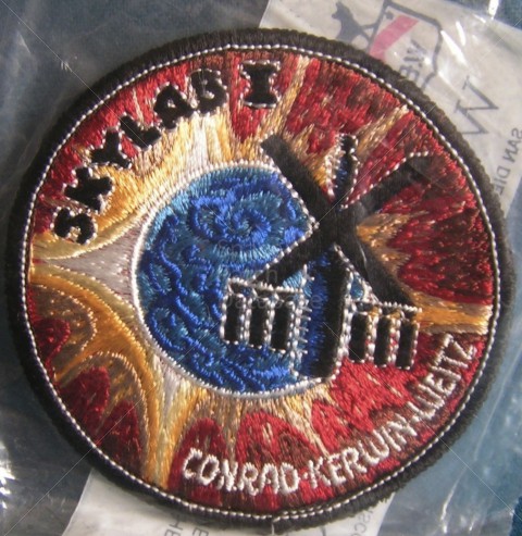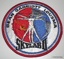 The Lion Brothers Skylab II patch has a bare cloth back and features hidden crew initials "BGL" upsidedown at the bottom of the red fill stitching.