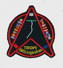 This is a very crude reproduction of the ASTP patch. Obvious faults are the lack of Cyrillic characters, substituting latin characters for the Soviet crew: "JIEOHOB" and "KYGACOB". There is a strange space in "SLAY TON" as well. Other details, such as the Soyuz and CM are remarkably passable.