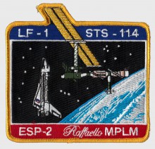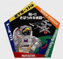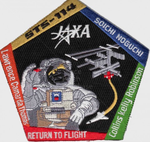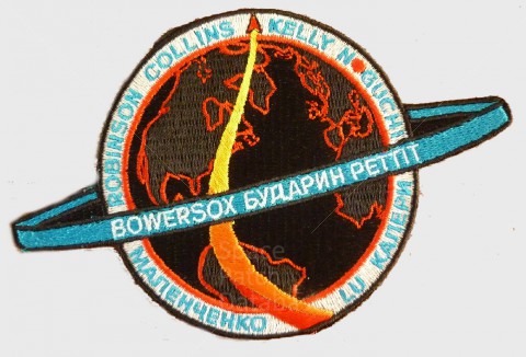 This concept patch was made by Randy Hunt and represents an updated crew manifest: Soichi Noguchi, Stephen K. Robinson, James M. Kelly, Eileen M. Collins, Edward T. Lu, cosmonauts Yuri I. Malenchenko, and Alexander Y. Kaleri.