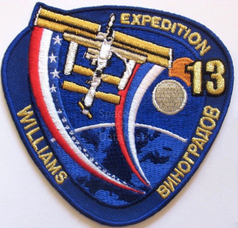 Alex Panchenko produced a number of patches for the Expedition 13 crew. Alex's patches use gold thread for the lettering. This version features a red border for Pavel Vinogradov. It has two names, lacking Reiter. It is executed on blue twill.  "Expedition" is in Cyrillic.