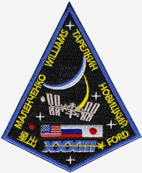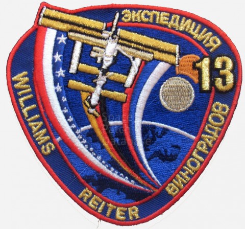 Alex Panchenko produced a number of patches for the Expedition 13 crew. Alex's patches use gold thread for the lettering. This version features a blue border for Jeffrey Williams. It has two names, lacking Reiter. It is executed on blue twill.
