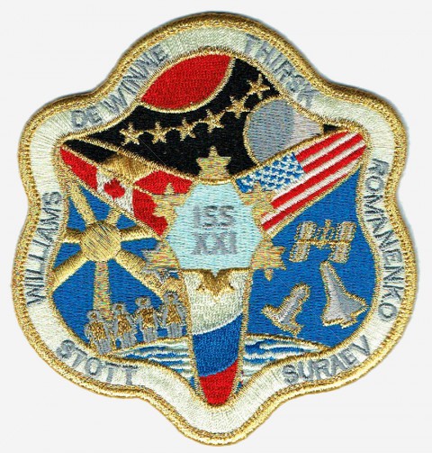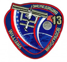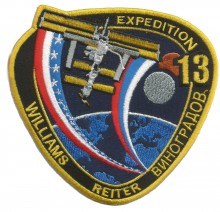 Alex Panchenko produced a number of patches for the Expedition 13 crew. Alex's patches use gold thread for the lettering. This version features a blue border for Jeffrey Williams. It has two names, lacking Reiter.