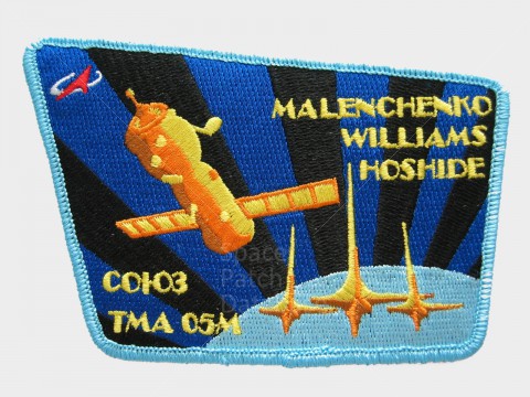 The Soyuz TMA-05M patch design depicts the spacecraft as it enters orbit, lit up by the rising sun. In design, colour and font, the patch is influenced by the Art Deco style. The vertical blue and black bands in the background refer to the similar design of the flag of the Russian Air Force. The three stars symbolize the three crew members. The design of the star is that of a monument on the grounds of the Yuri Gagarin Cosmonaut Training Center just outside Moscow.